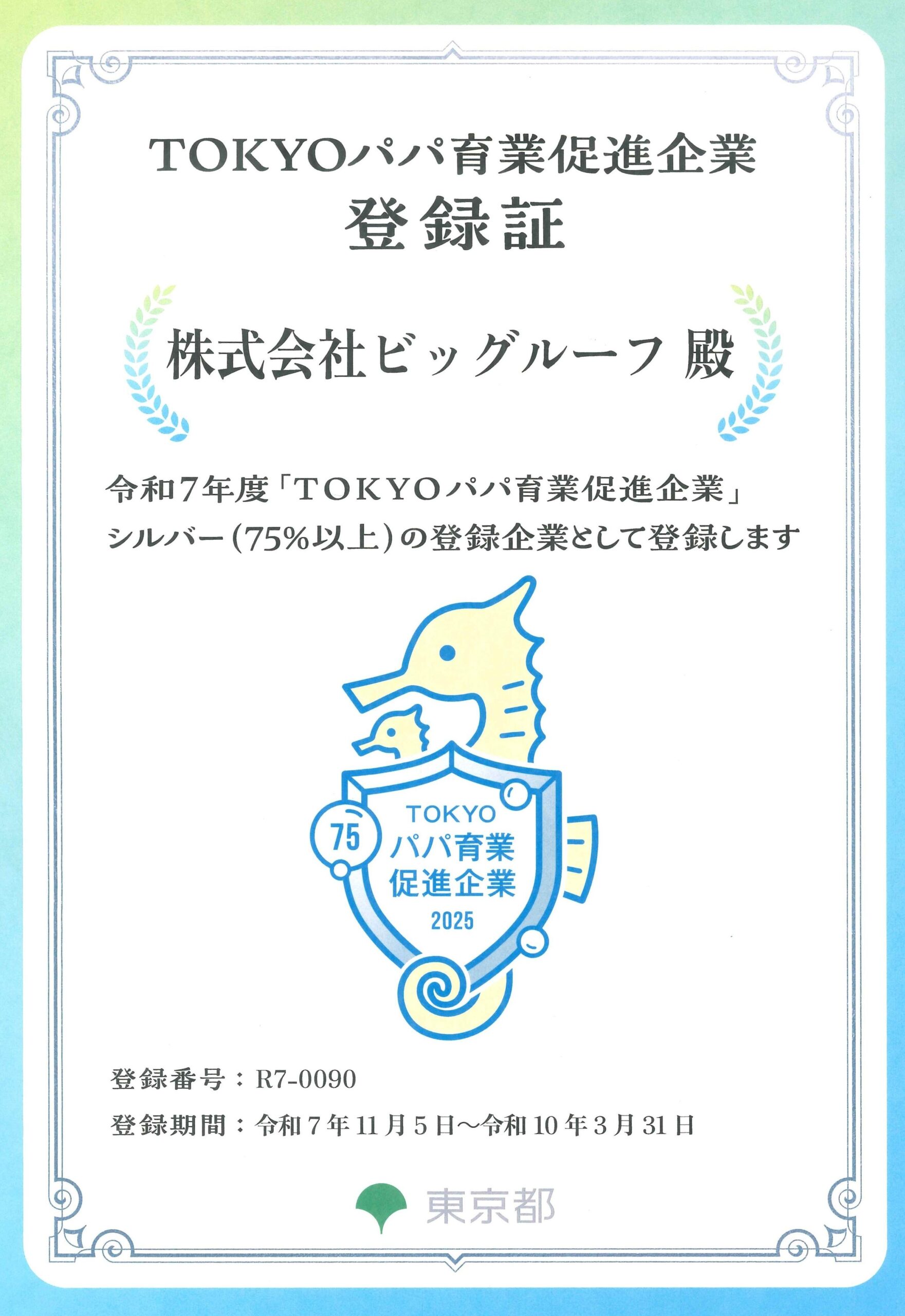 このたび株式会社ビッグルーフは、東京都『TOKYOパパ育業促進企業』制度において、「シルバー」に認定されました。