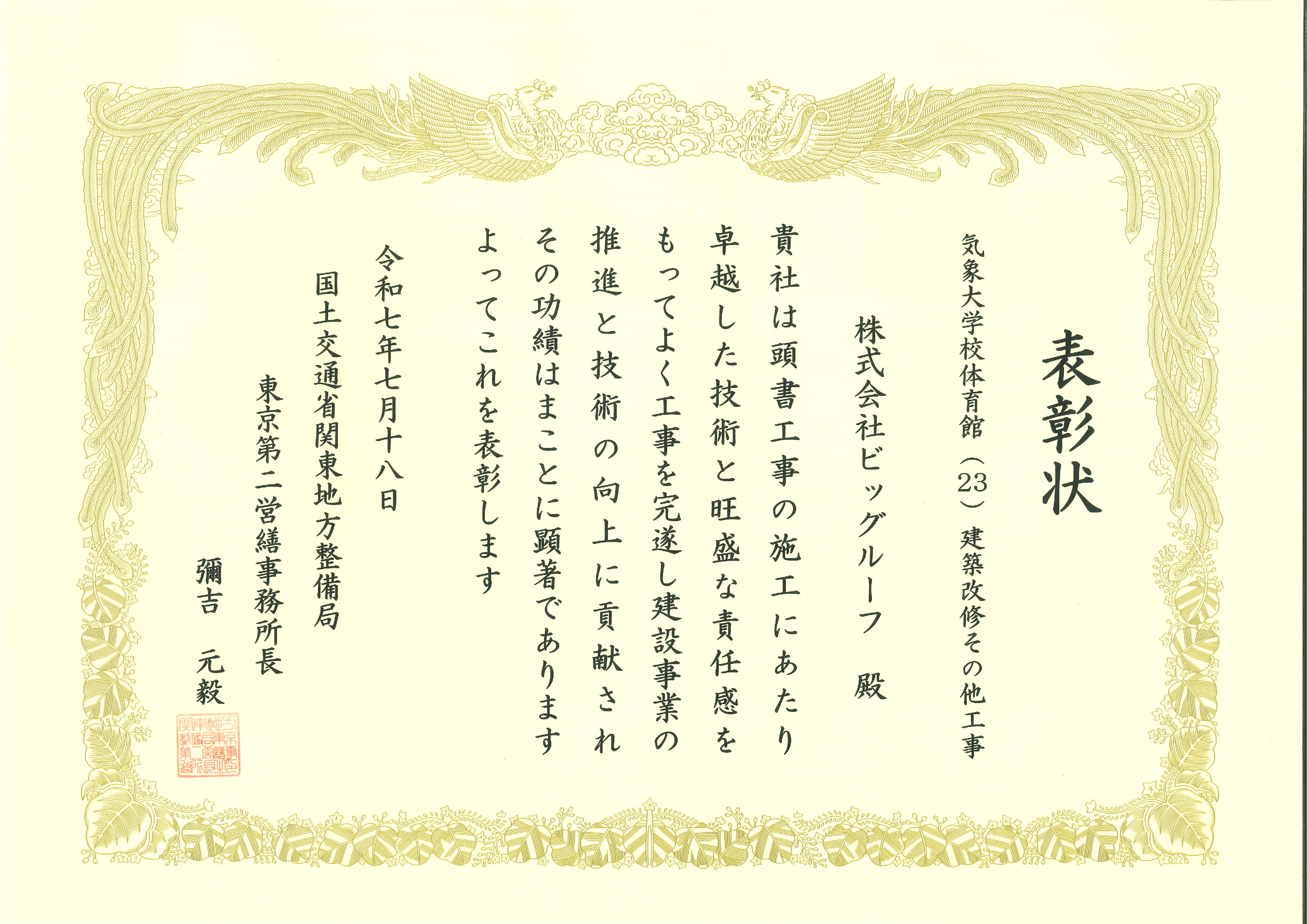 国土交通省関東地方整備局 第二営繕事務所様より表彰されました 2025. 08.01 お知らせ 2025年7月18日に、令和6年度優良工事等表彰式が開催され、優良工事として表彰されました。 ・令和6年度 優良工事等東京第二営繕事務所長表彰について 今回の表彰を励みとし、今後も品質向上に努めて引き続き高い評価をいただけるよう、全社一丸となって取り組んでまいります。 一覧に戻る